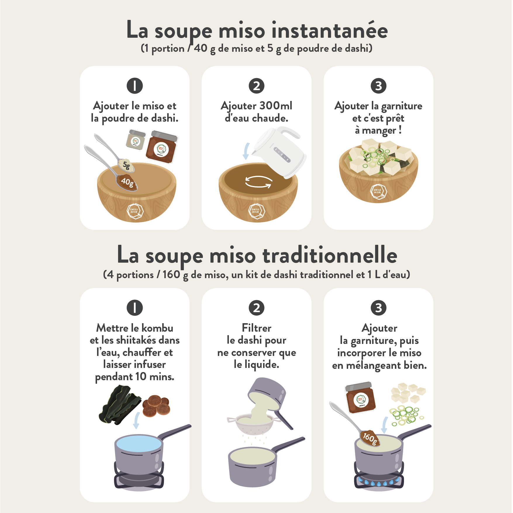 Le kit de soupe miso simple et sain. Il est facile à préparer à la maison. Composé uniquement d'ingrédients naturels soigneusement sélectionnés, sans additif, il vous permet, grâce à la poudre de dashi exclusif de SWISSMISO, de savourer la simplicité d’une soupe instantanée, ou d’utiliser le kit de dashi pour recréer chez vous une base de soupe miso traditionnelle japonaise.