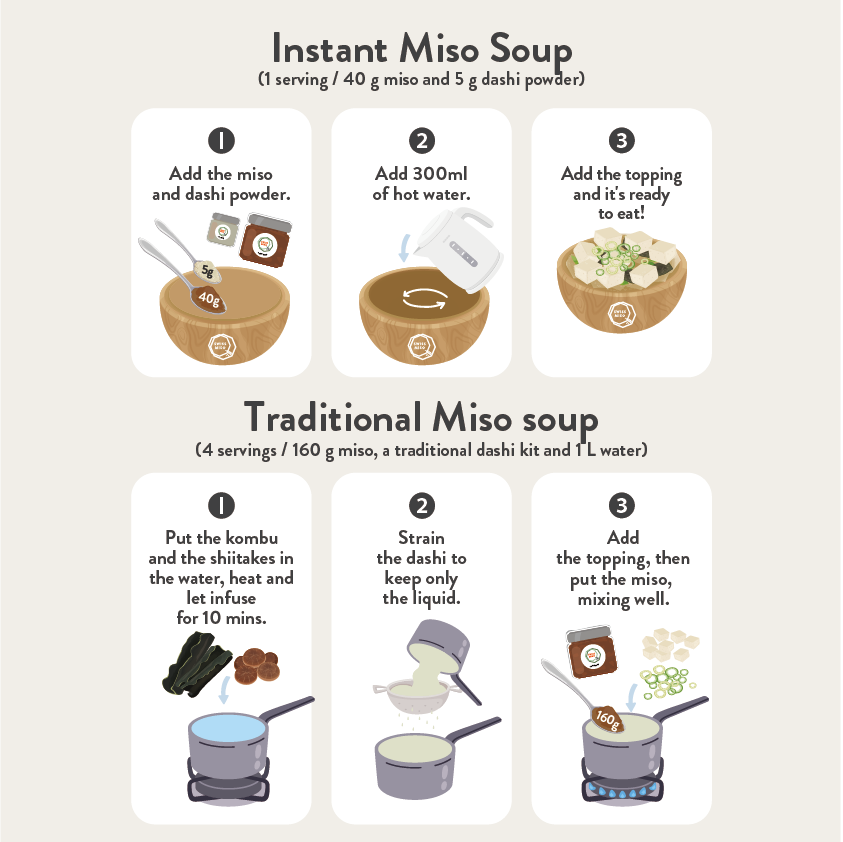 10 soupes miso au total ( 6 soupes miso instantanées, 4 soupes miso avec dashi traditional)
